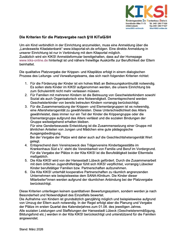 Liebe interessierte Leserinnen und Leser unserer Hompage, anbei finden Sie unsere Kriterien für die Aufnahme von Kindern in unserer Kindertagesstätte sowie die Beitragssätze, die wir erheben. Für Fragen hierzu stehen wir Ihnen gerne unter kita@kiks-online.de zu Verfügung. Viele Grüße von Ihrem KIKS! – Team -:)